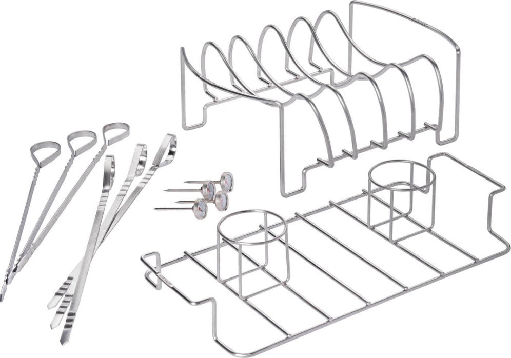 Complete Grilling Set: Everything you need is included—rib rack, double beer can chicken roaster, six skewers, and button thermometers. You're ready for any recipe!